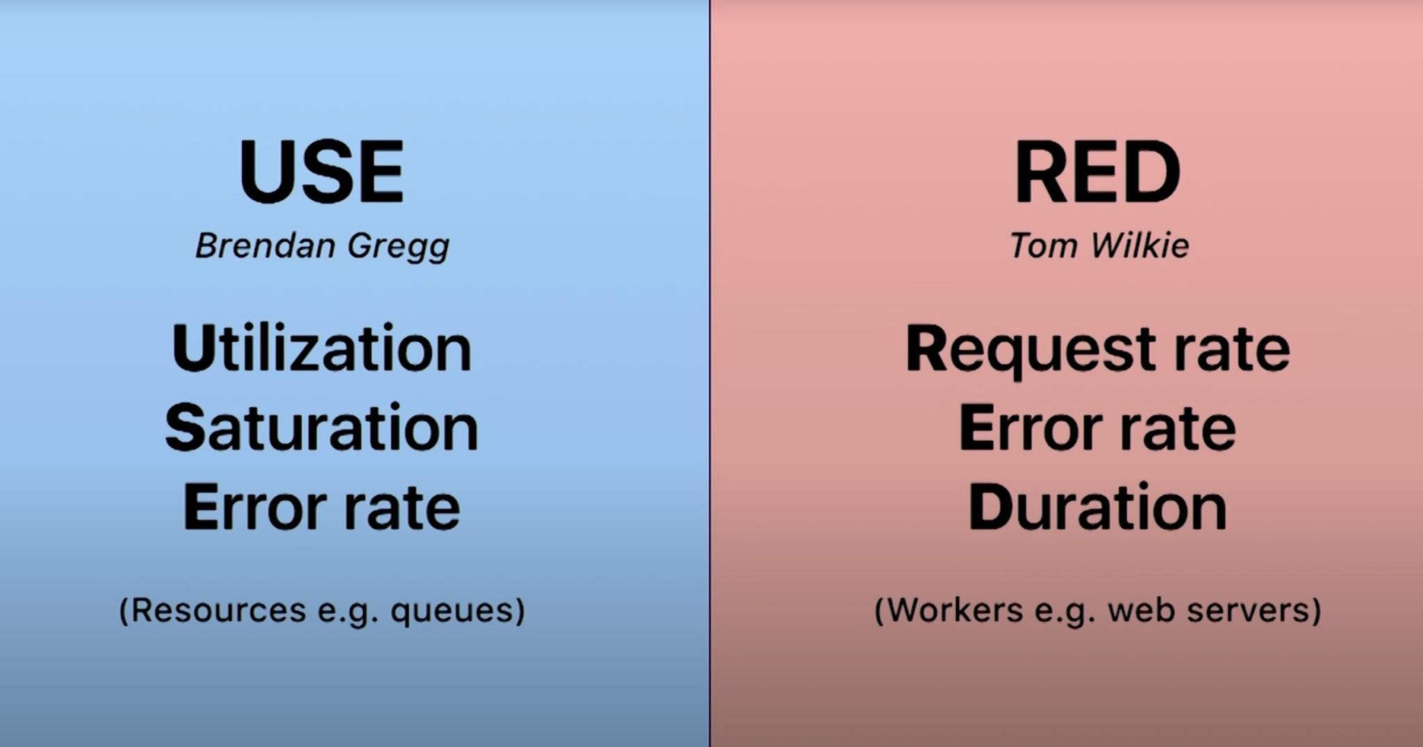 - RED Method: Rate, Errors, Duration.